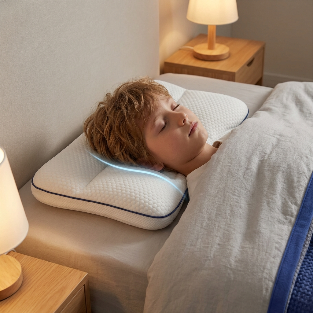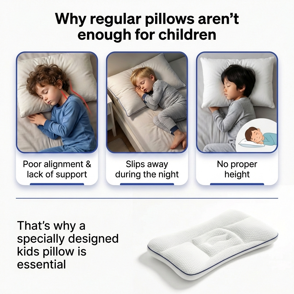 Most standard pillows are designed for adults — and for children, they’re often too high, too soft, or don’t provide stable support throughout the night. As a result, the head can tilt or remain misaligned, causing the neck and spine to lose their natural alignment.